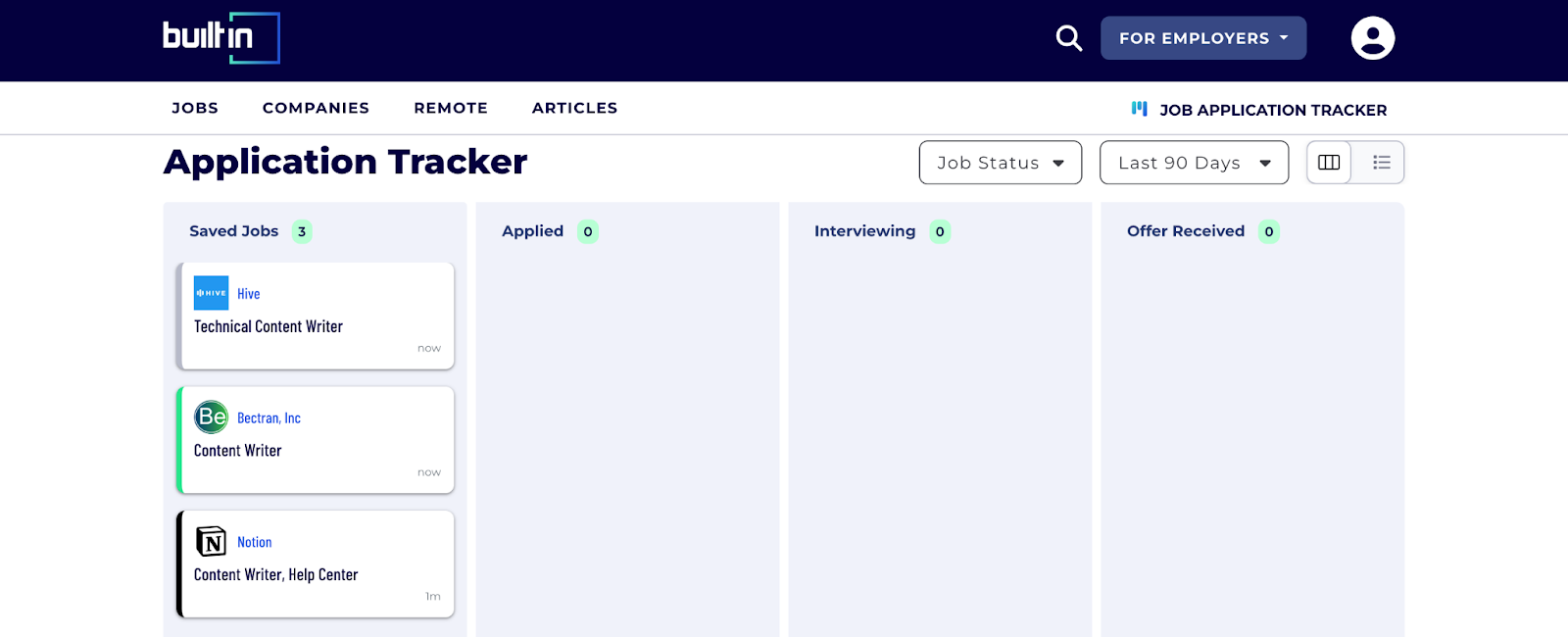 Built In’s dashboard includes an application tracker with stages like Saved, Applied, Interviewing, and Offer Received, plus a Saved Companies section. It helps you keep your job search organized and see where each application stands.