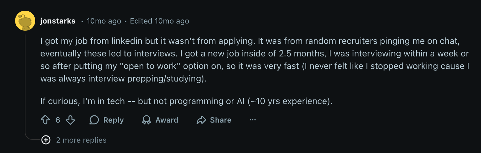 This reflects how LinkedIn often works best through passive sourcing rather than traditional job applications. Recruiters frequently initiate conversations, and an updated profile can lead to interviews surprisingly quickly, especially for experienced professionals in tech or similar fields.